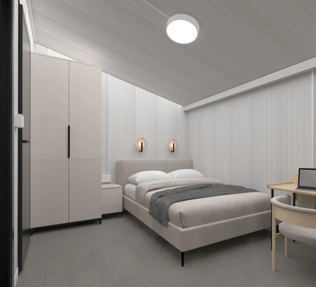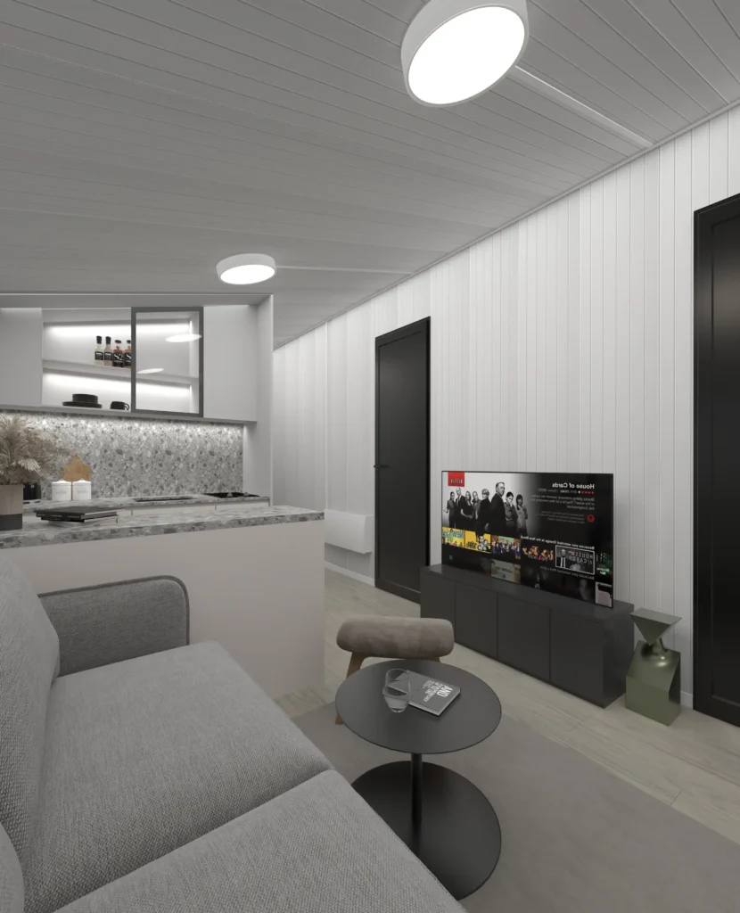 - Interiér s Dušou: Vnútorné priestory sú navrhnuté minimalisticky, s dôrazom na funkčnosť a komfort. Použité sú svetlé farby, kvalitné drevené prvky a inteligentné riešenia na úsporu miesta. Výsledkom je priestor, ktorý dýcha útulnosťou a modernosťou.