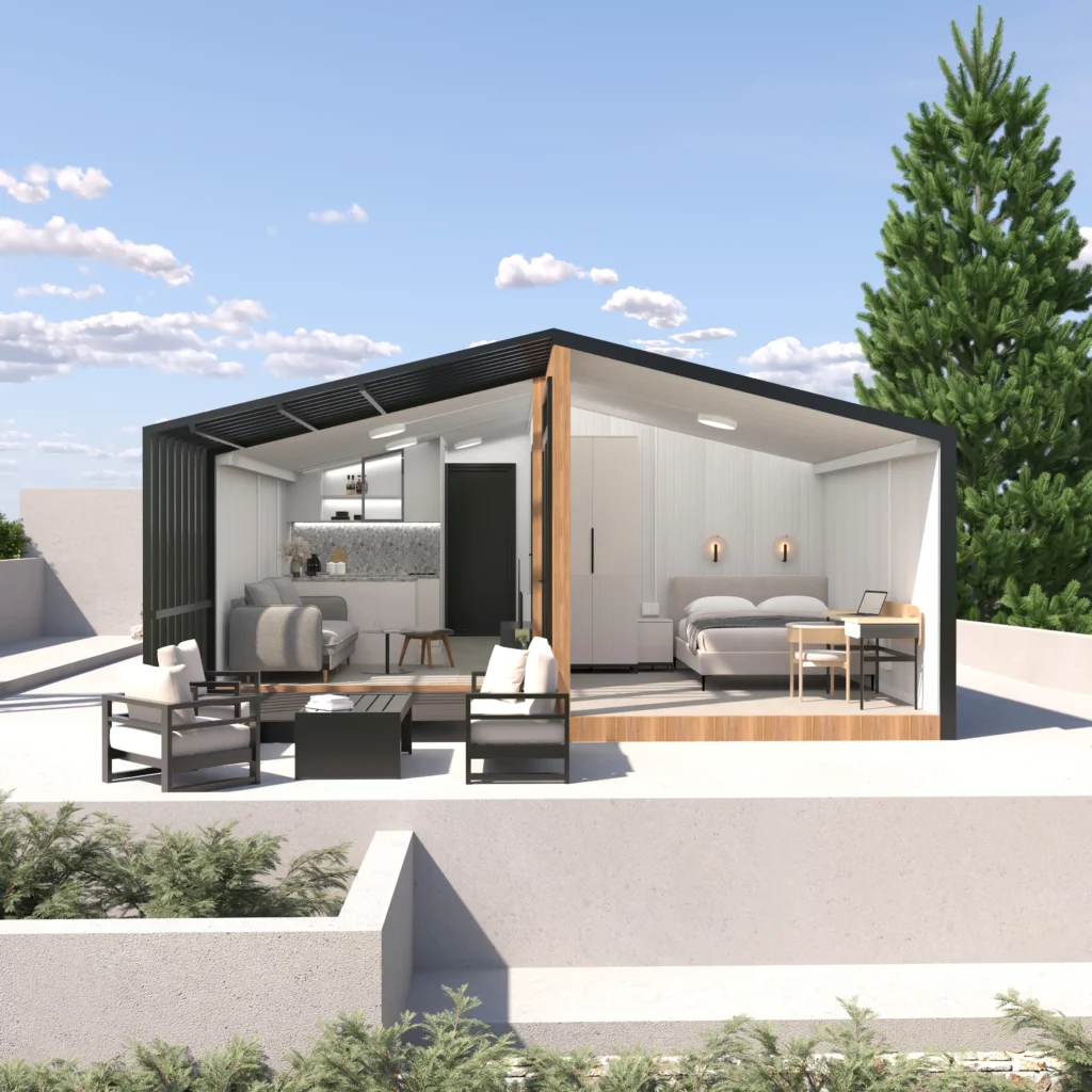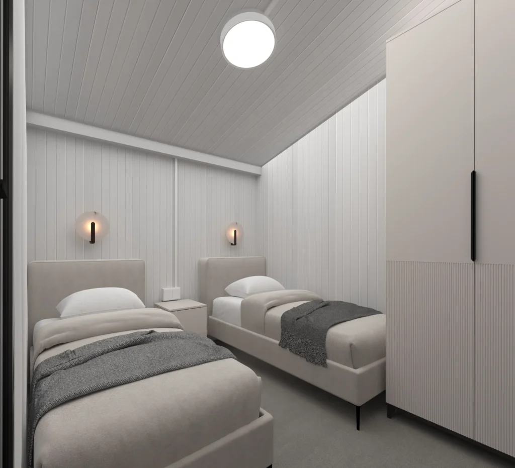 - Statická Istota: Využívame prirodzenú pevnosť kontajnerov na vytvorenie bezpečnej a stabilnej konštrukcie, ktorá umožňuje veľké presklené plochy a otvorené priestory bez potreby masívnych vnútorných stien.