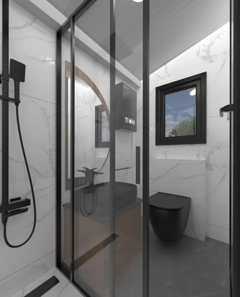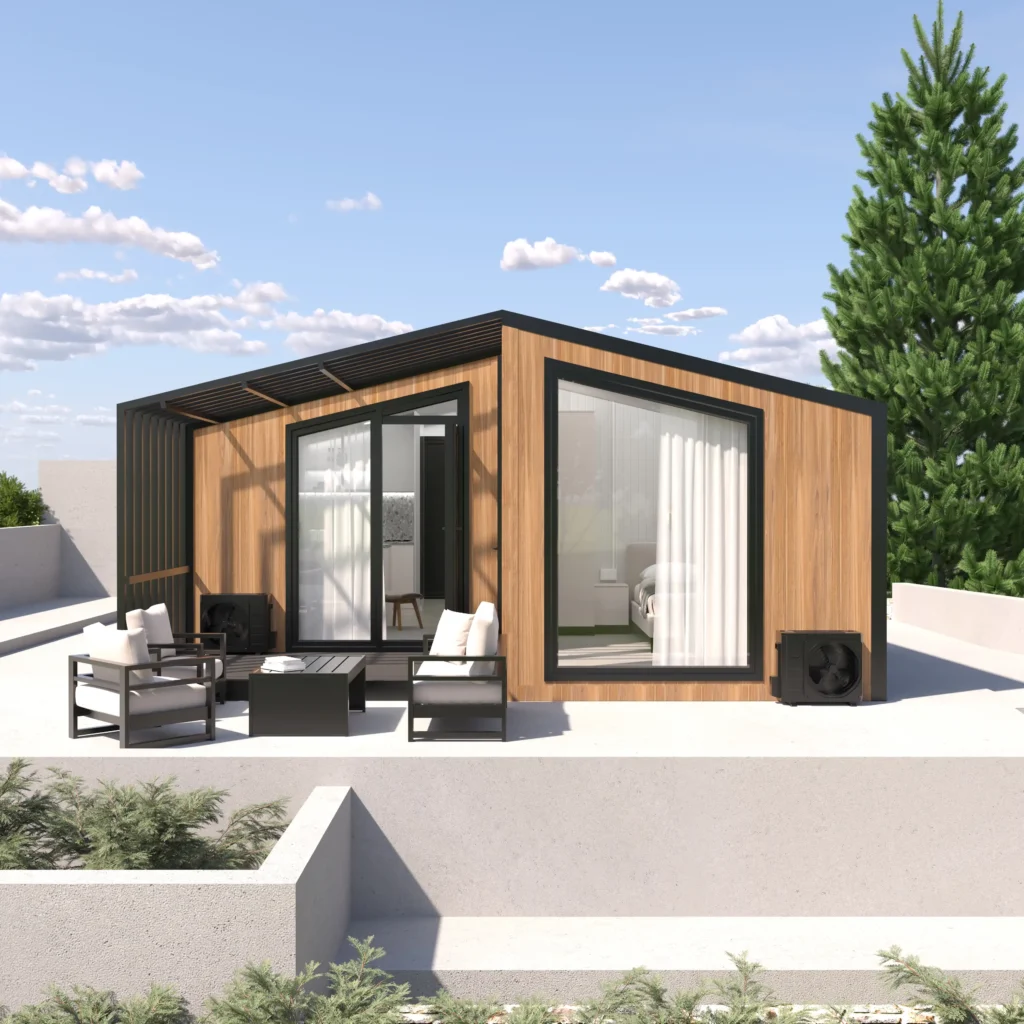 - Fasáda s Charakterom: Vonkajší vzhľad je upravený kombináciou moderných a prírodných materiálov – drevený obklad, antracitové panely a veľké okná – ktoré transformujú kontajner na elegantnú, súčasnú stavbu.
